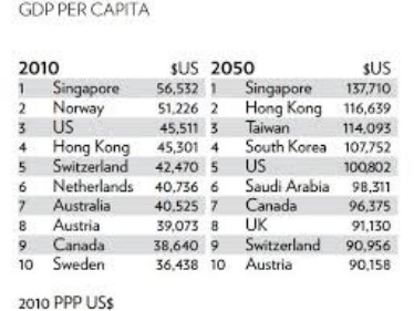 No en vano, entre 1976 y 2014, Singapur creció un 6,81% anualizado. Pero lo mejor es que su futuro no puede ser más prometedor, ya que se prevé que siga ocupando el primer puesto en 2050, con una renta de $137,710 (ajustado a poder adquisitivo de 2010).