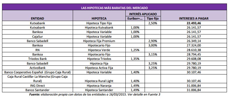En la tabla se observa la hipoteca más económica del mercado -la que generaría menos intereses- sería un préstamo a tipo fijo: la Hipoteca Fija de Kutxabank. Esta hipoteca aplica un interés del 2,5%. En un plazo de 16 años, quien decidiera contratar una hipoteca de 104.950 euros tendría que abonar unos intereses de 22.493,46 euros. Esta cifra supondría un ahorro de 3.650 euros (228 euros al año) con respecto a los intereses que habría que pagar con las siguientes ofertas más baratas: las hipotecas variables de Kutxabank, Bankoa y CajaSur. Las tres cobran a sus clientes euríbor+1% con lo que los intereses totales a pagar ascenderían a 26.141,57 euros.