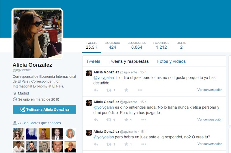 Especialmente agresivo fue el 'cara a cara tuitero' que mantuvo con la usuaria @yolygalan, quien escribía: "Lo digo alto y clarito... CULPABLE!!". González respondía: "Es lo que se llama pre-juzgar". Y Galán, de nuevo: "No tengo ningún problema, lo afirmo, para mí culpable!". "Pero habrá un juez ante el que responder, ¿no? ¿O eres tú?", le decía la periodista.