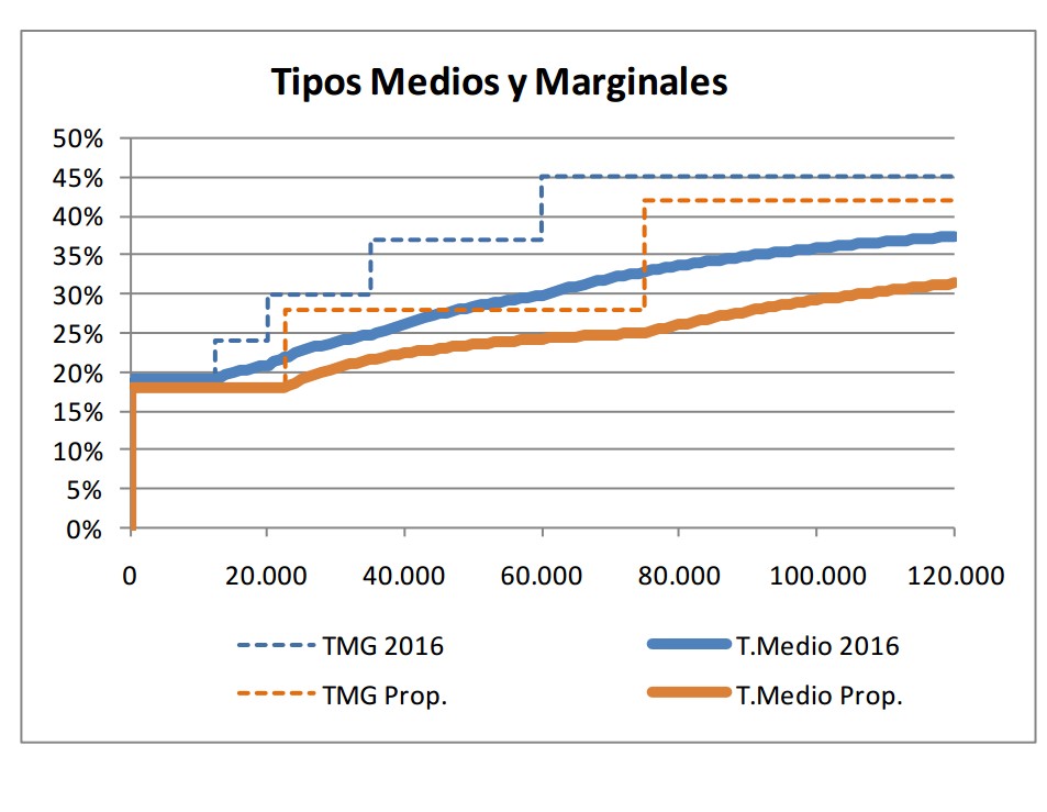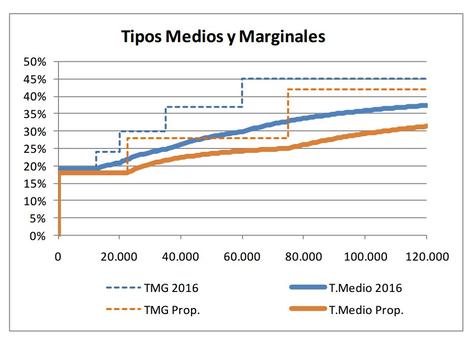 Con todo esto, a Garicano y Latorre les sale que se perderán unos 4.350 millones de euros de recaudación. O lo que es lo mismo, los contribuyentes tendrán a su disposición esa renta para hacer lo que estimen conveniente con ella. Según sus cuentas, tanto los tipos medios como los marginales son sustancialmente inferiores a los que había previsto para 2016 tras la aplicación total de la última reforma aprobada por el Gobierno (ver siguiente cuadro).