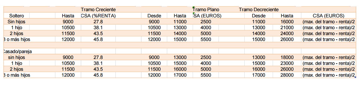 - Complemento Salarial Anual (CSA): probablemente será la promesa estrella del partido de cara a las próximas elecciones. Ciudadanos incluye un complemento salarial dentro de la estructura del IRPF. La idea es pagar a los asalariados con una especie de impuesto negativo y se elimina a cambio la reducción por rendimientos del trabajo. ¿Cuánto cobrará cada uno? Pues depende de su situación familiar y su renta. Las cifras están en el siguiente cuadro: existe un tramo creciente (a más renta, más CSA), luego un tramo plano y luego uno decreciente.