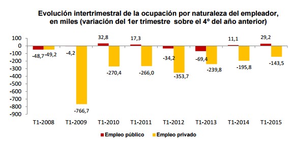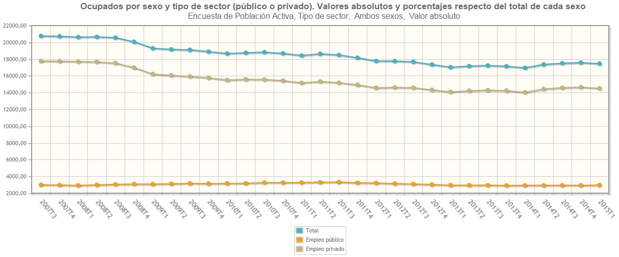 La práctica totalidad de este inédito descenso se concentra en el sector privado. A mediados de 2007, el empleo privado ascendía a 17,76 millones de personas frente a los 14,5 millones del pasado trimestre, lo que equivale a la desaparición de 3,26 millones de puestos de trabajo. El empleo público, sin embargo, tan sólo ha bajado en poco más de 33.000 personas durante la crisis, al pasar de 2,99 millones en 2007 a los 2,95 millones en la actualidad.