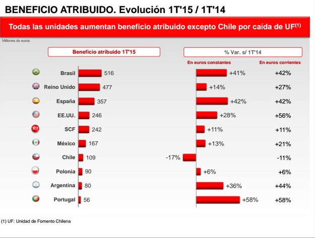 El 42% del beneficio tiene su origen en economías en desarrollo (Latinoamérica y Polonia) y el 58% restante, en las maduras. Por países, la mayor aportación corresponde a Brasil (21%), seguido de Reino Unido (20%), España (15%), EE.UU.(10%), México (7%), Chile (5%), Polonia (4%), Argentina (3%) y Portugal (2%). Santander Consumer Finance aporta un 10% al beneficio total.