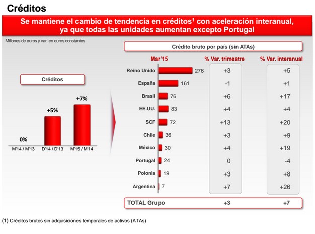 A finales de marzo de 2015, la cartera de créditos ascendía a 813.260 millones de euros, un 14% más que un año antes (7% sin efecto del tipo de cambio), lo que supone que el saldo de créditos ha aumentado en algo más de 100.000 millones de euros en un año. De los diez mercados claves donde opera el grupo, el crédito crece en todos menos Portugal.