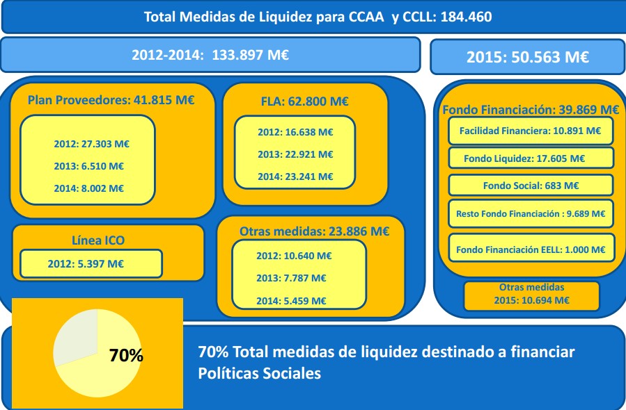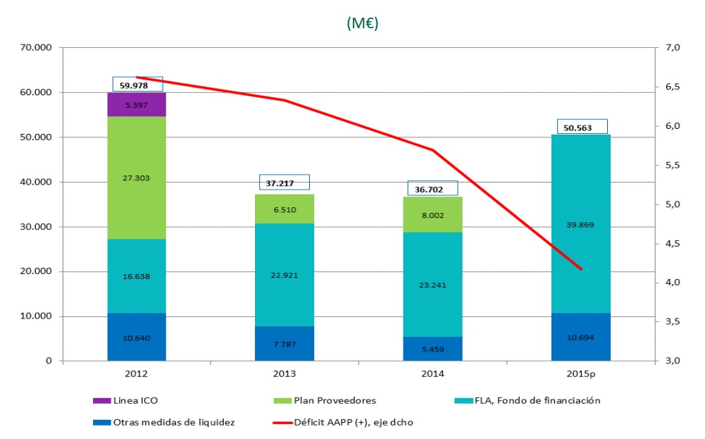 El dinero destinado al FLA entre 2012 y 2014 ronda los 62.800 millones, mientras que el Pago a Proveedores rozó los 42.000 millones de euros. A ello, cabe sumar la línea ICO (5.397 millones) y otras medidas de liquidez por valor de 23.886 millones de euros. En 2015, todos estos mecanismos son sustituidos por un nuevo Fondo de Financiación, cuya cuantía asciende a casi 39.900 millones, y otras medidas complementarias por valor de 10.700 millones, tal y como muestra el siguiente cuadro.