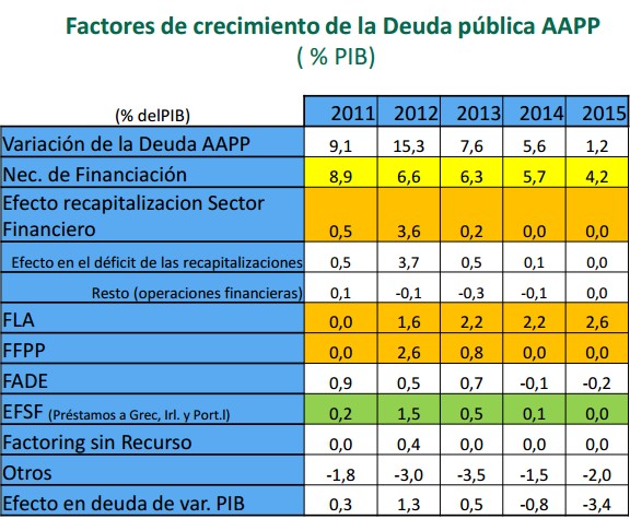 Así, tal y como se observa en el siguiente cuadro, la deuda se ha disparado en casi 30 puntos del PIB entre 2011 y 2015 (más de 300.000 millones de euros), pero de esta cifra unos 12 puntos del PIB corresponderían al FLA y al Plan de Pago a Proveedores (FFPP), mientras que la "recapitalización del sector financiero" apenas representa 3,8 puntos de aumento durante el mismo período.