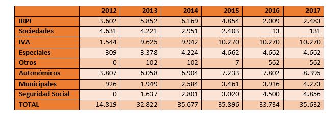 El siguiente cuadro, que simplemente cuantifica en miles de millones de euros las propias cifras del Gobierno remitidas a Bruselas (página 37), recoge cuánto han aumentado los ingresos fiscales con respecto a 2011 como consecuencia de los cambios en la normativa tributaria. Se incluye, por tanto, el impacto de las rebajas fiscales prometidas por el Gobierno para 2015 y 2016.