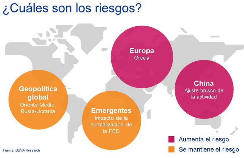 Sin embargo, dichas estimaciones no están exentas de riesgos, ya que esta mejora depende, en buena medida, de factores exógenos, como el precio del petróleo, la depreciación del euro, los bajos tipos de interés que está propiciando la política monetaria del Banco Central Europeo (BCE), el mayor crecimiento derivado de la UE o factores geopolíticos (Grecia, Ucrania, Oriente Medio...). Es decir, la principal amenaza radica en que la economía española depende más de la coyuntura externa que de sus propias fortalezas.