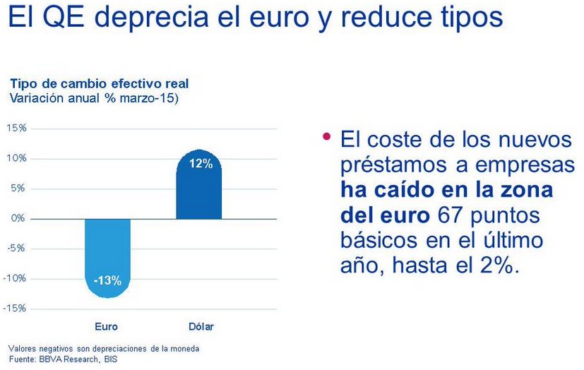 Tanto BBVA como el último informe de previsiones de Bruselas publicado al martes coinciden en que el plan de compras de activos por parte del BCE está contribuyendo a reducir los tipos de interés, especialmente en el mercado de deuda pública, y a depreciar el euro, lo cual, unido al abaratamiento del petróleo y el carácter menos restrictivo de la política fiscal, explican, en gran medida, la reciente mejoría económica de la zona euro y, por extensión, de España.