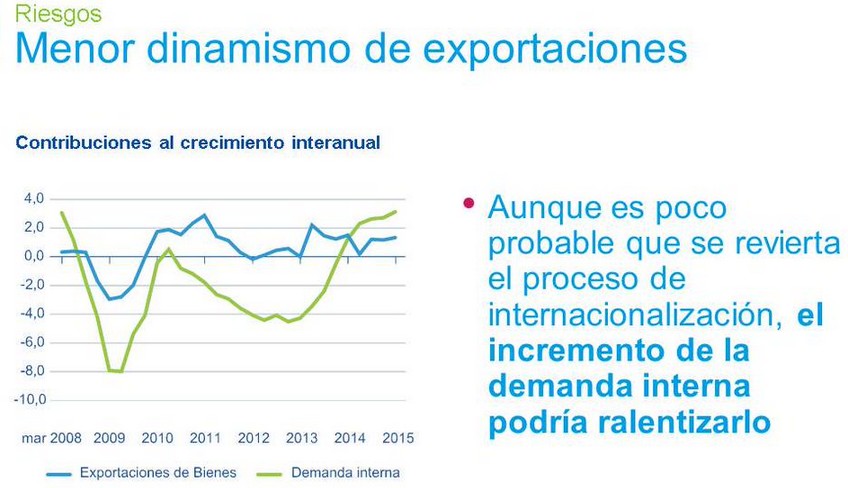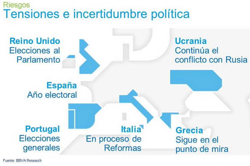 Sin embargo, dichas estimaciones no están exentas de riesgos, ya que esta mejora depende, en buena medida, de factores exógenos, como el precio del petróleo, la depreciación del euro, los bajos tipos de interés que está propiciando la política monetaria del Banco Central Europeo (BCE), el mayor crecimiento derivado de la UE o factores geopolíticos (Grecia, Ucrania, Oriente Medio...). Es decir, la principal amenaza radica en que la economía española depende más de la coyuntura externa que de sus propias fortalezas.