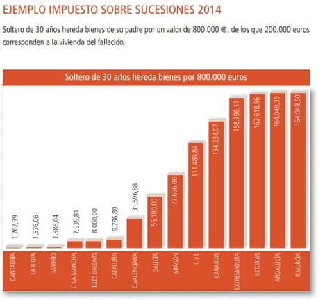 La anterior tabla muestra cuál es la tarifa que debería pagar un soltero que recibiera una herencia valorada en 800.000 euros. Como vemos, hay una enorme diferencia entre las regiones. Podemos plantea como mínimo igualar a todas con las más altas. De hecho, al pedir la eliminación de todas las bonificaciones, todo apunta a que el resultado final sería incluso peor que en las comunidades con menos ventajas para los herederos (porque todas las regiones incluyen de una forma u otra alguna mejora respecto al régumen general).