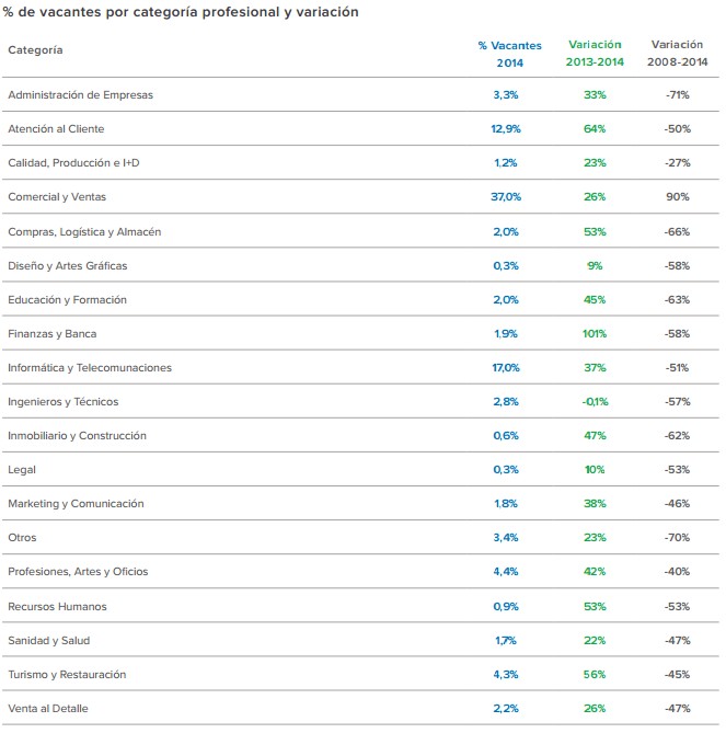 Las ofertas crecieron en todas las categorías y sectores laborales, excepto en el caso de los ingenieros y técnicos, en donde se mantuvieron igual respecto al año pasado. El sector que más ha incrementado el número de vacantes ofertadas en el periodo es el de comercial y ventas, informática y telecomunicaciones y atención al cliente. Comercial y ventas es la primera categoría profesional en volumen de vacantes.