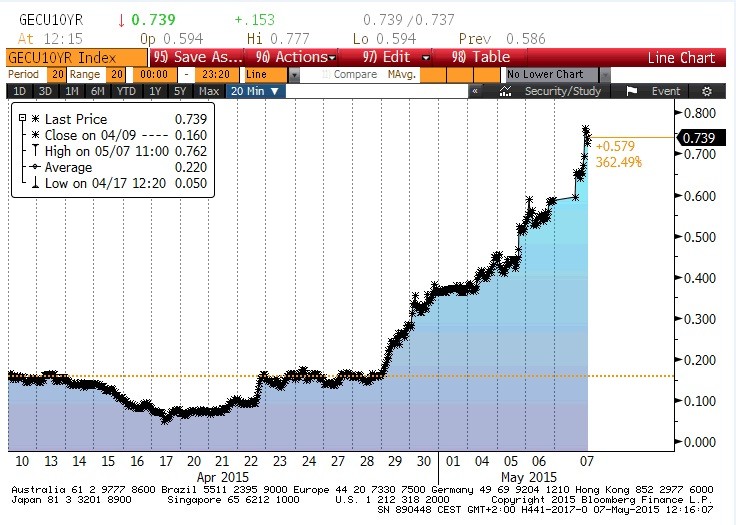 En renta fija, a menor precio, mayor rentabilidad. Pues bien, en tan solo unas pocas sesiones, la caída de los precios de los bonos alemanes ha provocado que la rentabilidad anual de su bono a diez años haya pasado del 0,05% al 0,73%, es decir, de rozar las rentabilidades negativas a marcar niveles que no se veían desde diciembre del año pasado.