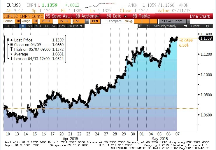 - Este miedo a una retirada prematura del programa es el que está causando estragos no solo en los mercados de deuda sino en los de divisas, donde el euro está volviendo a subir. Solo hace falta ver el gráfico del tipo de cambio eurodólar para darse cuenta: