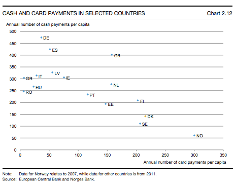 En paralelo, el banco central danés y las entidades financieras del país han anunciado que, en el corto o medio plazo, el efectivo pasará a la historia. Países vecinos como Suecia siguen el mismo camino, mientras Italia, Grecia o España se encuentran en el extremo opuesto, según las cifras del BCE que ha analizado Norges Bank.