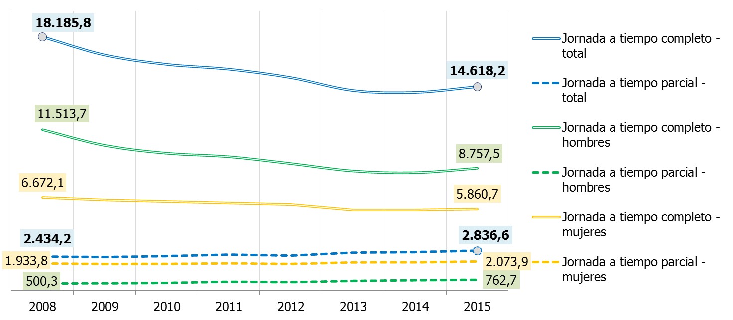 Las mujeres han sido, tradicionalmente, aquellas que han desarrollado en mayor medida jornadas de trabajo a tiempo parcial. En este sentido, la proporción de empleados a tiempo parcial en 2007 era de 4 mujeres por cada hombre. En 2015, sin embargo, se ha reducido a 3 mujeres por cada hombre. Este acercamiento ha venido motivado por el mayor incremento de varones con esta jornada (+41% desde 2007) frente a la menor variación en mujeres (+6,8% desde 2007).