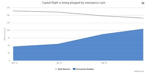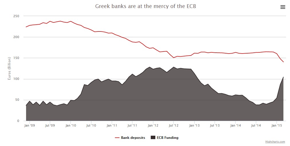 Como resultado de esta masiva salida de dinero, los bancos griegos han tenido que recurrir a las líneas extraordinarias de liquidez del BCE (ELA, por sus siglas en inglés) para mantenerse a flote y, de este modo, no cerrar sus puertas. Hoy por hoy, su supervivencia depende de que el BCE restrinja o no dichos préstamos, con lo que Grecia se enfrenta a un posible corralito en caso de que el presidente del organismo monetario, Mario Draghi, cierre el grifo.
