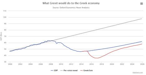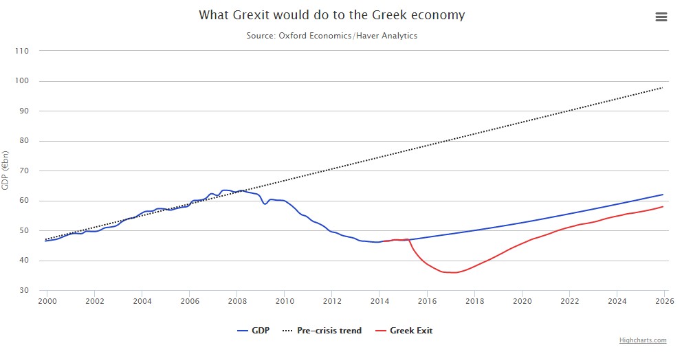 Y lo más grave es que, en el peor de los escenarios, la salida de Grecia del euro se traduciría, entre otras muchas consecuencias desastrosas, en una fuerte recesión y, sobre todo, en un PIB potencial más bajo a medio y largo plazo. Es decir, en un menor nivel de riqueza y bienestar para el conjunto de los griegos.