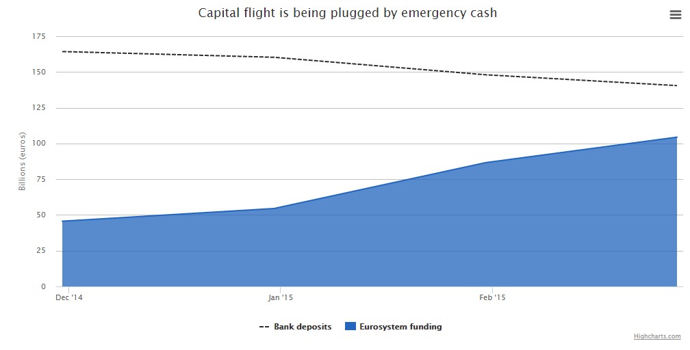 La primera consecuencia visible del auge de Syriza, antes incluso de ganar las elecciones, fue reactivar la intensa fuga de capitales y depósitos que empezó a sufrir el país en 2010, cuando recurrió al rescate externo para evitar el default. Desde el pasado diciembre hasta finales de febrero, los griegos han sacado de los bancos cerca de 25.000 millones de euros, tal y como muestra el siguiente gráfico, elaborado por Mehreen Khan en The Telegraph.