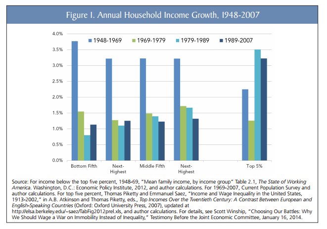 Analizando el periodo que va de 1948 a 1969, Winship encuentra que la ratio anual de crecimiento de los ingresos se coloca en cifras especialmente elevadas entre todos los segmentos de renta. Las décadas siguientes reflejan un ritmo de aumento más bajo, pero igualmente se observan tasas positivas en todos los niveles de ingresos.