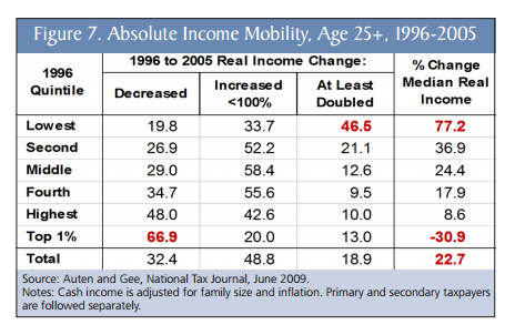 De hecho, comparando los niveles de renta de estos distintos grupos, el informe señala que quienes figuraban en el 20% de menos renta allá por 1996 tenían en 2005 un aumento en sus ingresos del 77%. Esta tasa es positiva entre todos los tramos, menos en el 1% más rico, donde la evolución observada fue una caída del -30,9%.