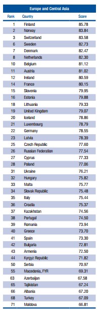 2015, España pasa del puesto 29 al 41ª y se sitúa por detrás de países como Kazajistán, Portugal, Rumania o Grecia. Como hay tantas clasificaciones y rankings, un número puede no dar una visión clara de lo que hay detrás. Por eso, quizás lo más sencillo sea mirar la tabla de la izquierda (click para ampliar) que recoge sólo a los países europeos y de Asia Central. La posición de España es preocupante. No es que nos ganen los ricos países del norte del continente (los nórdicos, Alemania, Francia, Reino Unido,...); es que, con la excepción de Bulgaria, estamos por debajo de toda la UE, incluso de los países del este. Sólo ganamos a países como Armenia, Serbia, Macedonia o Azerbaijan.