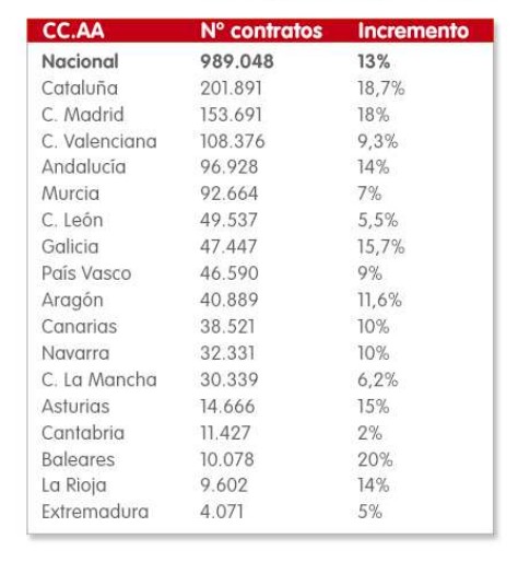 Si comparamos los datos actuales con los de 2014, podremos observar que todas las comunidades españolas van a generar un mayor número de contratos este año con respecto al año anterior. Cabe destacar los incrementos de Baleares, cercano al 20%; Cataluña, que se queda en el 18,7% y el de la la Comunidad de Madrid, que rondará el 18%.