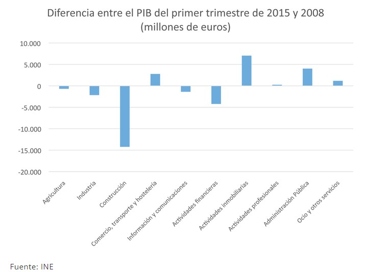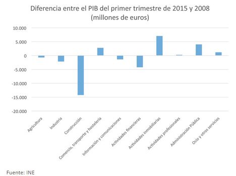 Empecemos comparando el valor añadido bruto generado por cada sector de la economía española en el primer trimestre de 2015 con el generado en el primer trimestre de 2008 (justo antes de pinchar la burbuja y entrar en la crisis económica).