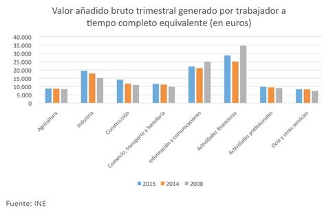 En el siguiente gráfico puede observarse cómo el valor añadido bruto generado por cada trabajador a tiempo completo equivalente no sólo ya es mayor en casi todos los sectores de lo que lo era en 2008, sino, sobre todo, también que en 2014 (es decir: la creación de empleo acaecida durante el último año no ha acarreado una reducción de la productividad dado que en todos los sectores se genera un valor agregado por trabajador mayor del que se generaba hace un año).