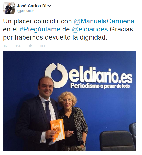 José Carlos Díez, conocido por su habitual presencia en tertulias televisivas, ha publicado una foto en Twitter en la que se muestra especialmente feliz del buen desempeño electoral de Manuela Carmena. "Gracias por habernos devuelto la dignidad", declara el economista madrileño.