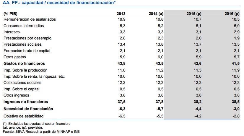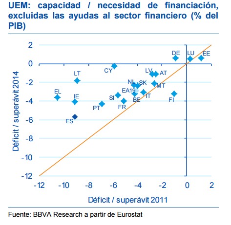 Según advierte BBVA Research en su último informe sobre la situación económica de España, "la recuperación de la actividad, junto con la moderación de los costes de financiación, favoreció la reducción del déficit público español de aproximadamente 0,6 puntos del PIB durante 2014". Así pues, "la reducción observada del déficit podría atribuirse casi exclusivamente a la mejora cíclica de la actividad, poniendo fin al tono restrictivo de la política fiscal iniciada en 2010", aclara.
