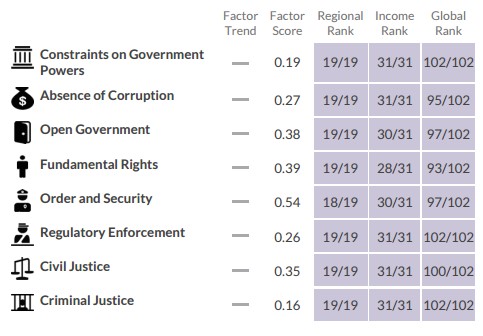 El índice de Estado de Derecho lleva a examen a 102 países y utiliza 47 indicadores divididos en ocho factores: límites al poder gubernamental, ausencia de corrupción, gobierno abierto, derechos fundamentales, orden y seguridad, cumplimiento regulatorio, justicia civil y justicia penal.