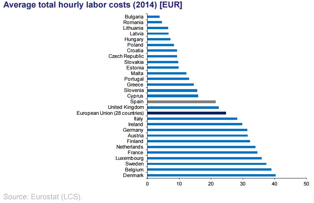 Pero no hablamos de eso. La cuestión es más general. La pregunta es, ¿cuánto cobramos los españoles en comparación con los trabajadores de los demás países de la UE? ¿Hay algo especialmente llamativo en nuestras condiciones laborales? Y la respuesta es que más o menos ganamos lo que nos corresponde en función de nuestra productividad. También es verdad que no es mucho, al menos si nos comparamos con los países más ricos de la UE. Pero es que somos mucho menos productivos que daneses, alemanes o austriacos. Por eso ganamos menos que ellos... desgraciadamente.