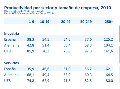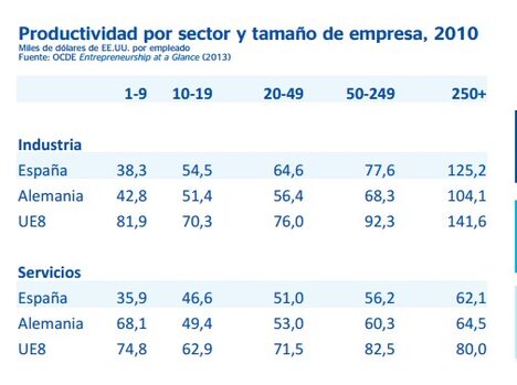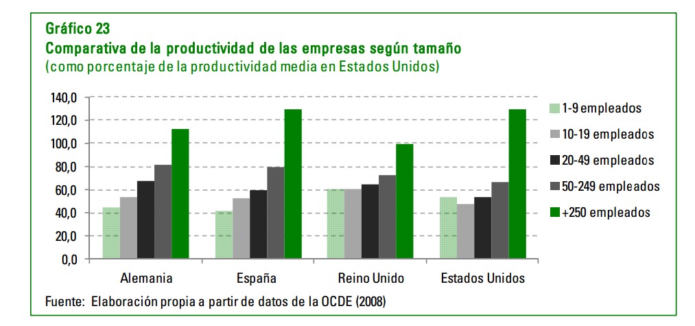No hay más que mirar los dos siguientes gráficos. Muestran la productividad según el tamaño de las empresas. En el primero, del Círculo de Empresarios, se compara a las empresas españolas con las americanas, británicas y alemanas. Puede verse que no hay grandes diferencias. Eso sí, en todos los países se repite el mismo patrón: a más tamaño, más productividad.