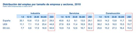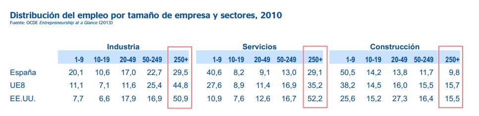 Y entonces, por qué nuestras empresas en conjunto son mucho menos productivas. Parece claro que no es porque lo hagamos mal. En igualdad de condiciones, nos comparamos bastante bien con nuestros vecinos. El siguiente cuadro lo explica. No jugamos en igualdad de condiciones. Nuestro tejido empresarial está dominado por las pymes y micropymes, entre otras cosas porque nuestra legislación dificulta su crecimiento.