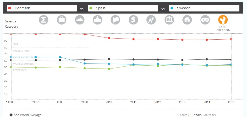 Por ejemplo, los siguientes tres gráficos muestran el coste del despido en España en comparación con otros países, la flexibilidad laboral en Europa, según el Índice de Libertad Económica del Wall Street Jornal y la Fundación Heritage, y la comparación entre España y dos de los países que se cogen como modelos a menudo por los derechos que otorgan a sus trabajadores. No sólo no hay diferencias, sino que, si acaso, el sistema español es más paternalista que el de los países de nuestro entorno. Quizás sea hora de preguntarse si todos esos "derechos" de los que tanto se habla son una ayuda o una rémora para esos mismos trabajadores a los que se supone que defienden.