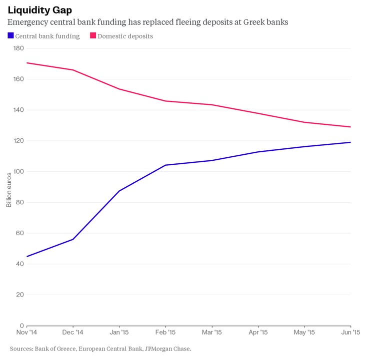 Ante tal escenario, y a la vista de que, por el momento, no se atisba un acuerdo entre Grecia y la troika, la población helena ha acelerado la retirada de depósitos de los bancos en los últimos días, agravando aún más su extrema crisis de liquidez. En concreto, los griegos habrían sacado cerca de 1.000 millones de euros el jueves y entre 3.000 y 4.000 millones desde el pasado lunes, según fuentes financieras consultadas por Reuters. Es decir, casi el 3% de los depósitos de familias y empresas griegas en solo una semana.