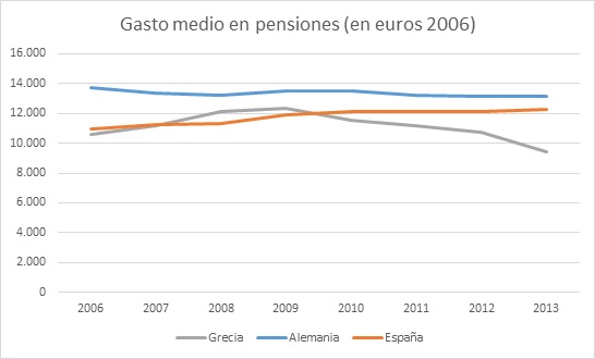 La reducción del gasto medio en pensiones de jubilación y viudedad ha sido apreciable hasta la fecha, pero apenas ha bastado para reubicarlo en los niveles del año 2005 (descontando el efecto de la inflación). De hecho, es fácil observar que en el año 2009 el gasto medio en pensiones era mayor en Grecia (12.380 euros al año) que en España (11.870): esto es, como media, el pensionista griego le costaba más al Fisco que el pensionista español.