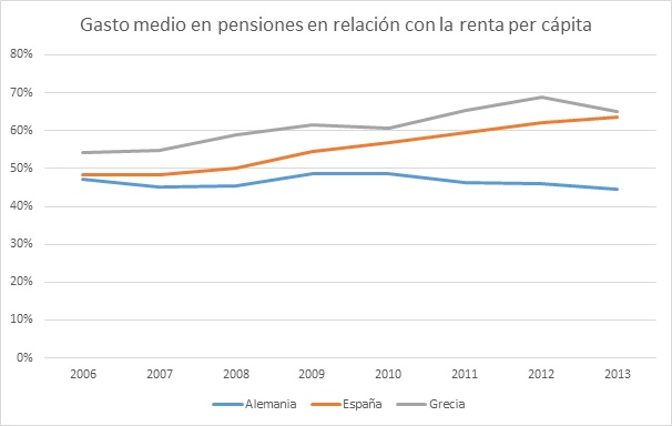 Semejante situación constituía una insostenible anormalidad financiera, en tanto en cuanto España ya era entonces sustancialmente más rica que Grecia (no digamos hoy). El peso del gasto medio en pensiones sobre la renta per cápita del país habla por sí solo: en 2009 representaba el 61% de la renta per cápita de Grecia, frente al 55% de España o al 49% de Alemania.