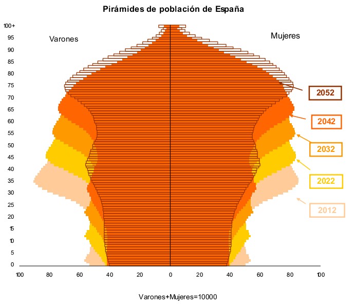 La evolución demográfica de España a lo largo de las próximas décadas vendrá marcada por un creciente envejecimiento de la población (la esperanza de vida al nacer ha subido de 77,1 años en 1991 a 82,2 años en 2012) y una menguante población activa debido a la baja tasa de natalidad. Es decir, España carece de relevo generacional. Los niños que tendrían que mantener a los futuros jubilados, simplemente, no han nacido.