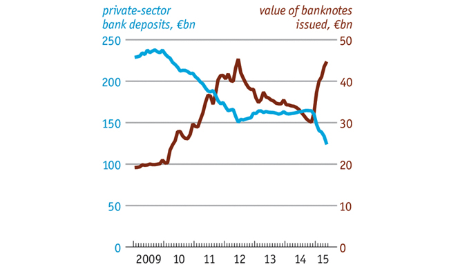 Según ha publicado la agencia de calificación Moody's en un comunicado, en los últimos 15 días han salido 8.000 millones de euros de los bancos helenos. Además, desde finales de noviembre los depósitos griegos han caído en 44.000 millones.
