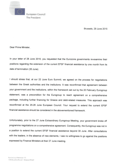 Lamentablemente, antes de la reunión extraordinaria del Eurogrupo celebrada el pasado 27 de junio, su gobierno rompió las negociaciones para llegar a un acuerdo. En consecuencia, el Eurogrupo no está en posición de extender el programa de rescate más allá del 30 de junio. Tras consultarlo con los líderes y en ausencia de nuevos elementos para considerar, no encuentro voluntad de contradecir la posición que fijaron los ministros de Finanzas en su reunión del 27 de junio.