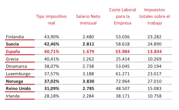Según explica Civismo, un sueldo neto de 1.679 euros paga en España un tipo impositivo real del 40,71%, una vez consideramos el IRPF y las cotizaciones sociales correspondientes. Este umbral tributario coloca a nuestros contribuyentes en el mismo nivel que Finlandia (43,90%) o Suecia (42,46%).