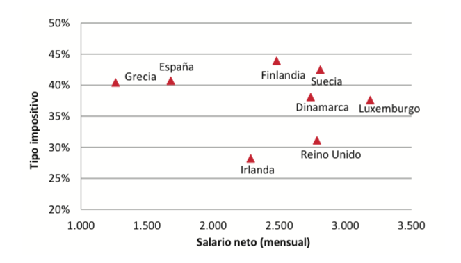 Este último aspecto es relevante, pues el caso español tiene la peculiaridad de combinar sueldos más bajos con impuestos más altos. Esta anomalía solamente se da en otro país analizado por Civismo. Se trata de Grecia, donde la fiscalidad real de las rentas del trabajo es del 40,41% sobre un sueldo neto mensual de 1.262 euros.