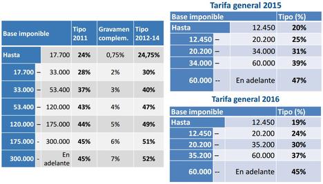 En el siguiente cuadro, están los tramos de la tarifa general del IRPF desde 2011 (los que había cuando llegó Rajoy) hasta 2016 (los que se han adelantado al 1 de julio). También están los vigentes de 2012-2014 (tras la subida de impuestos que el Gobierno aprobó en diciembre de 2011, nada más llegar a La Moncloa):