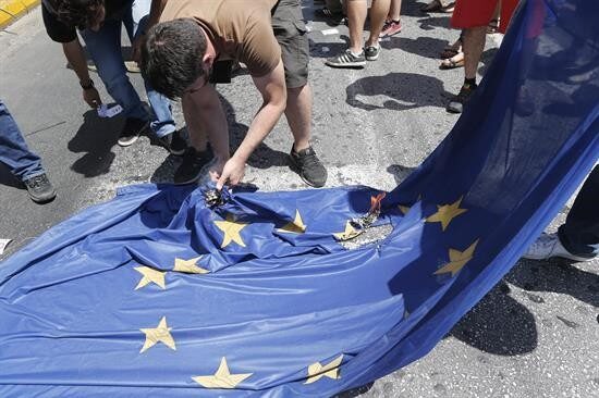 Arden las banderas de la Unión Europea en Atenas. Simpatizantes de Syriza partidarios del no en el referéndum convocado para el próximo domingo han decidido ponerse a quemar banderas de la UE en las calles de la capital griega.