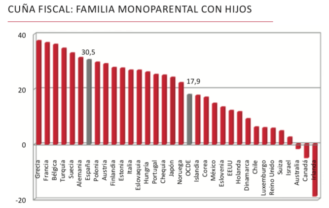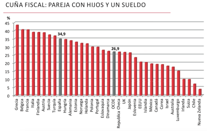 Pero Civismo ha ido más allá y también ha analizado la presión fiscal que soportan las parejas con hijos en los distintos países de la OCDE. Según el informe, un hogar en el que hay hijos y un sueldo mensual aguanta una "cuña fiscal" del 34,9% frente al 26,9% que se paga, de media, en las economías desarrolladas. Hablamos de un diferencial del 29% en contra de los contribuyentes de nuestro país.