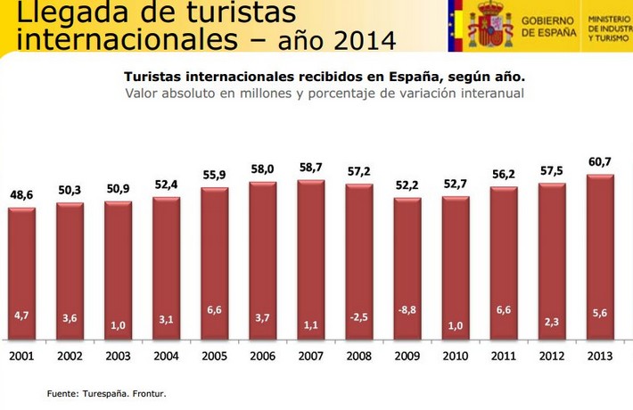 El año 2014 fue un regalo para el sector turístico español. Nuestro país batió por segundo año consecutivo un nuevo récord en afluencia de turistas extranjeros. Con 64,9 millones de visitantes, 4,3 millones más que el año anterior, 2014 se convirtió en el mejor año de la historia del sector.