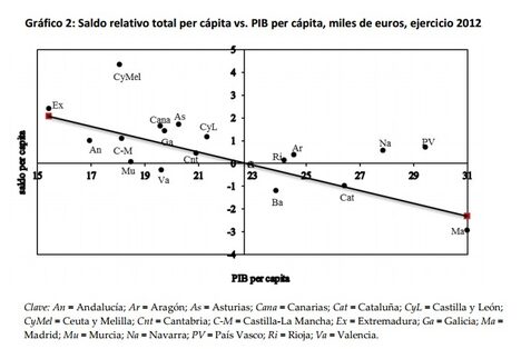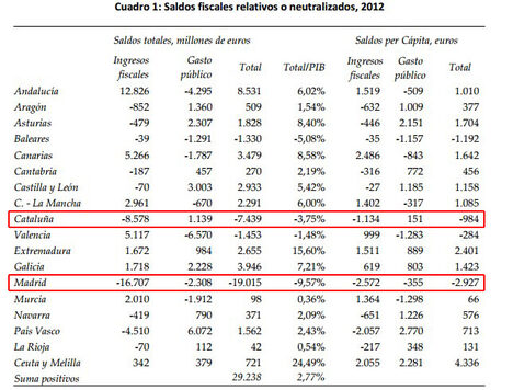 El siguiente cuadro muestra un resumen de los datos de Hacienda, en términos totales y per cápita. Hay que aclarar que no hablamos de cifras absolutas de impuestos o gastos del Estado en cada región (por eso hay regiones con impuestos negativos y otras con gastos negativos), sino en términos comparativos con la media. Es decir, muestra el exceso o defecto respecto a lo que le tocaría a cada comunidad si todas recibieran lo mismo según sus habitantes: "En todos los casos, un signo positivo del saldo correspondiente a una región nos indica que ésta mejor tratada que la media, esto es, que recibe más gasto o soporta menos impuestos por habitante que la media española".