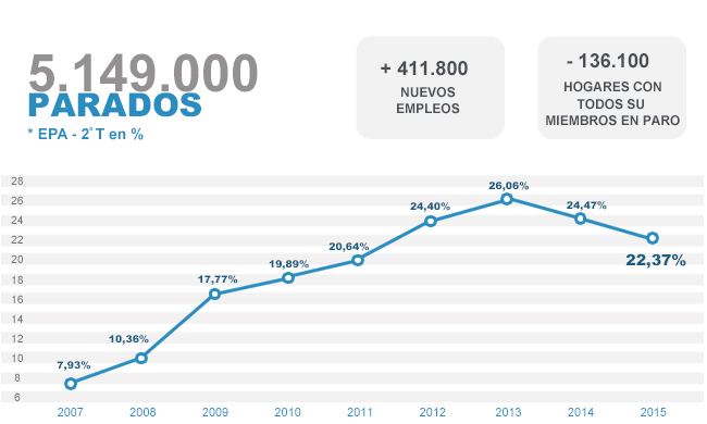 Según Mariano Rajoy, la Encuesta de Población Activa (EPA) del segundo trimestre de 2015 ha sido la mejor que se recuerda: "Nunca en la historia económica se había creado tanto empleo en un trimestre". "España va como una moto", ha apuntado en una conversación informal Fátima Báñez. "Giro de 180º, cambio estructural, cada vez más rápido por el buen camino..." Escuchando a los miembros del Gobierno y del PP, parece claro que el optimismo se desborda.